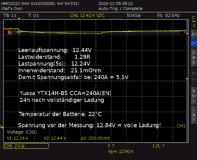den Innenwiderstand gemessen. (Leerlaufspannung, 5s mit 1R belastet,